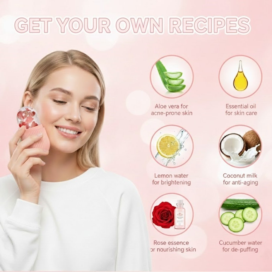 Reusable and refillable, allowing you to create a fresh ice cube for every session. Customize your ice recipes with options like lemon water for brightening, green tea for soothing inflammation, cucumber water for swelling reduction, mint for freshness, or coconut milk for added nourishment.